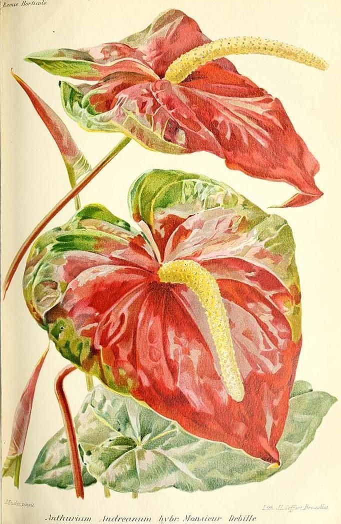 Su llamativa espata en forma de corazón, con un color que puede ir del rojo intenso al blanco puro, cumple las funciones de una flor (es en realidad una bráctea transformada), siendo la espádice de color amarillo la verdadera inflorescencia. Este conjunto la ha convertido en una planta ornamental muy apreciada tanto en maceta como en flor cortada, a pesar de su toxicidad, con numerosos cultivares e híbridos.