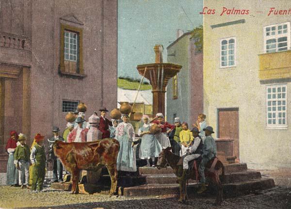 Las Palmas contaba con un complejo sistema de distribución que, a principios de siglo XX, estaba conformado por 26 fuentes públicas -14 en vegueta y 12 en Triana- a las que acudían de manera obligatoria ciudadanos acompañados de cántaros, tinajas, porrones. De esta forma "un buen número de mujeres y niños se dedicaban a transportar agua desde las fuentes públicas a la mayoría de las casas particulares. Las fuentes y los lavaderos eran los pocos sitios que tenían para reunirse y donde tenían oportunidad de cotillear sobre las cosas del pueblo. El agua la llevaban en barriles sobre mulas o sobre sus cabezas." (I. Latimer, 1887. Pág. 196).