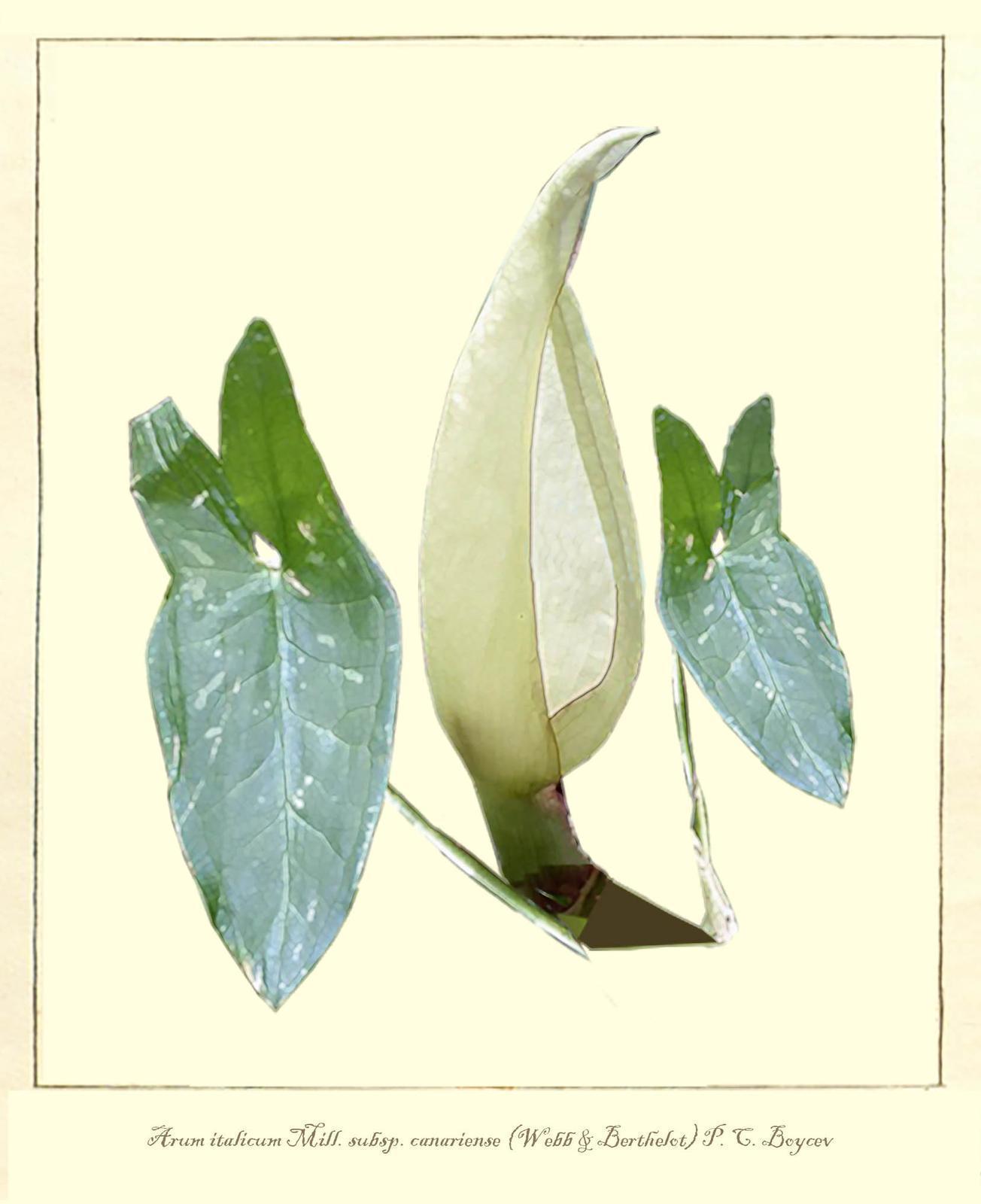 Esta especie es hoy considerada un sinónimo de Arum italicum subsp. canariense (Webb & Berthel.) P.C.Boyce. Inicialmente se identificó como una especie propiamente dicha, pero hoy se considera un taxon intraespecífico del Arum italicum Mill. Es una planta geófita, rizomatosa, que puede estar oculta buena parte del año, apareciendo en superficie en los meses más fríos (diciembre, enero) hasta florecer en primavera. El fruto es un racimo de bayas de color rojo, y posiblemente se dispersa por endozoocoria. Se desarrolla en la Macaronesia, estando presente en todo el archipiélago canario, Madeira y las Azores, generalmente asociado a la laurisilva, aunque se encuentra también en zonas inferiores, allí donde encuentre suficiente humedad (bosque termófilo). Se diferencia de otras subespecies por sus espatas púrpuras en el interior de los tubos, pecíolos y pedúnculos igualmente purpurados en lugar de verdes, y estaminodios en solo 2 o 3 verticilos.Procedencia