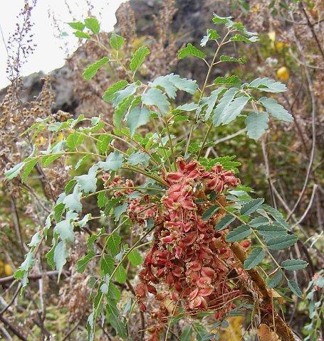 Es un arbusto dioico con hojas, de un verde azulado, que contrastan con el intenso rojo de sus tallos superiores, siendo sus hojas nuevas también de coloración roja. Las flores masculinas son verde-amarillentas, mientras las femeninas son de color rojo-purpúreas. Tiene semillas aladas (sámaras). Se le atribuyen ciertos usos medicinales, en especial para el tratamiento de heridas, y como astringente antidiarreico.Procedencia