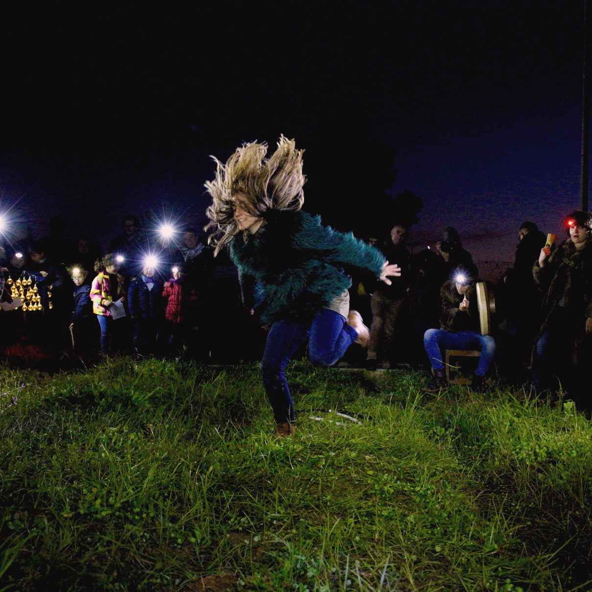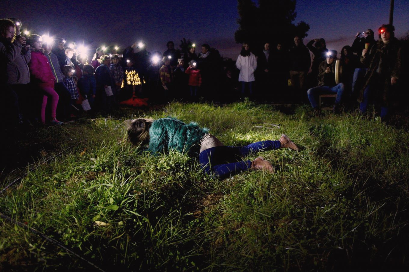 Equipados con las coronas de luz, todos nos dirigimos en un silencio no planificado hasta uno de los huertos de la entrada donde todas las luces rojas permitieron iluminar un momento mágico, Rocío interpretaba un cante de trilla. En este huerto, a la luz roja de las coronas, todo se concentró y parecía que los portadores de las coronas también habían ensayado durante semanas en los huertos. Tras la intervención de Rocío, el bodhran de Elo tomo el relevo y dio comienzo al movimiento de María dentro del huerto, vestida con una chaqueta que parecía hierba. Las luces pasaron de rojas a blancas para acompañar este movimiento y los niños volvieron a encender las suyas como se les había indicado y cuando nos dimos cuenta, el conjunto de los asistentes estaba iluminando intensamente la acción, de nuevo como si lo hubieran estado ensayando. Cuando el movimiento acabó, lo hizo con el sonido inesperado de unos tubos de goma que sorprendieron a todos antes de emprender un paseo más por el huerto a oscuras. De nuevo precedido por el sombrero de Anna, se inicio una procesión hacia el fondo del huerto, encabezada por una melodía interpretado por Elo a dos flautas. Tras ella, deshaciendo la oscuridad, se adivinaban los cuerpos coronados por cincuenta y siete luces. Al final del paseo, todos reunidos, se volvió a interpretar el villancico de la Vega de Triana, esta vez cantado por todos, antes de pasar al chocolate y el anís.