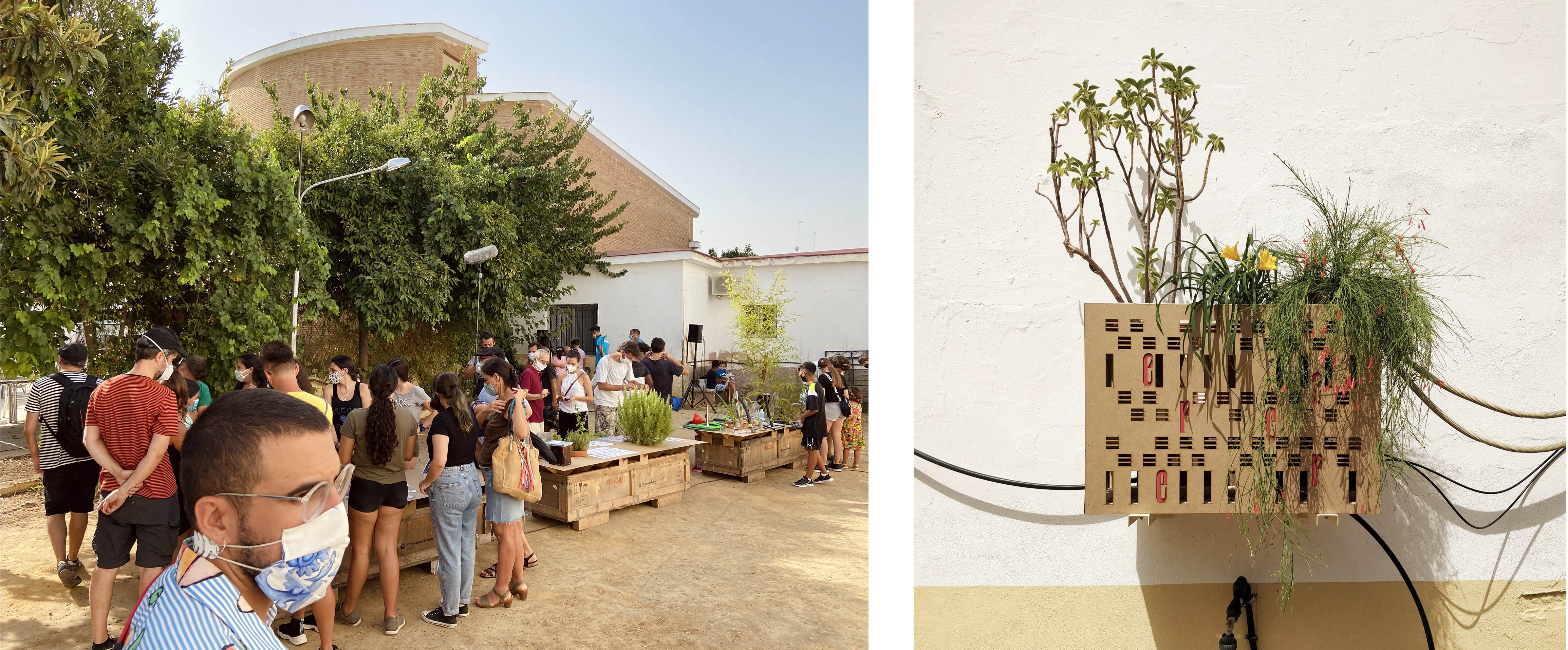 Al levantar la vista y continuar el recorrido por las distintas instalaciones, los visitantes se podían hacer una idea de en qué consistía el proyecto. Las primeras mashrabiyas, diseñadas por Beatriz Pavón y Antonio Bonilla, de Estudio Pätē, ya estaban instaladas en la fachada del edificio, y los conductos de desagüe de los aparatos de aire acondicionado, redirigidos para reutilizar el agua desechada como agua de riego en este jardín vertical compuesto de lavanda, mirto, romero, hiedra, gitanillas, hierbabuena...