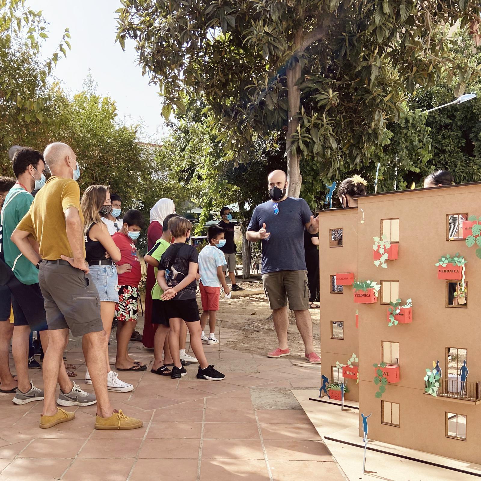 La propuesta creativa de Collateral Estudio era la primera parada en la muestra instalada en el jardín de la Asociación La Candelaria. “Esta es una maqueta a escala 1:10 de un edificio cualquiera del barrio en la que hemos ido colocando los prototipos de las mashrabiyas que los chicos y chicas han diseñado”, contaba Buzón. Además de estos prototipos, la fachada estaba llena de vida con las siluetas del resto de alumnos y alumnas participantes en el proyecto, que fueron recortando en el taller de diseño digital y corte láser.