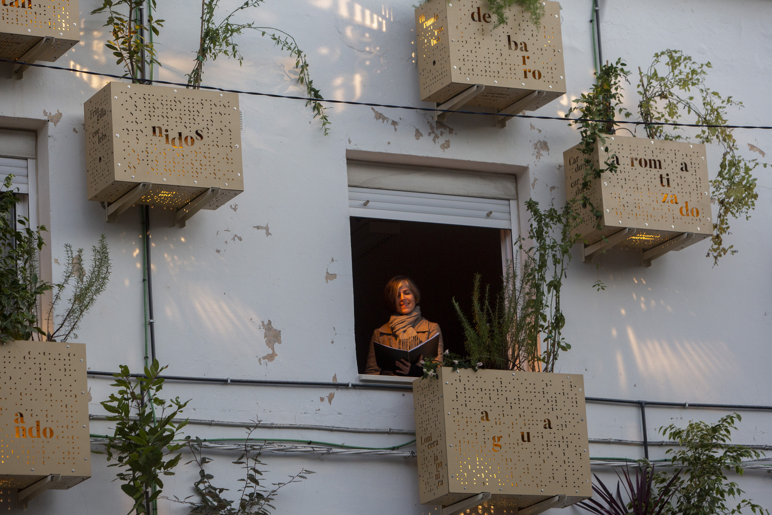 “Cultivamos jardines / destilando agua / de los aires”. Nuestro manifiesto, impreso en las mashrabiyas que contienen nuestro primer jardín vertical queda iluminado -y estará así durante todas las navidades, para disfrute del vecindario. Hoy hemos celebrado el solsticio de invierno. La última estación del año, el final que también es un comienzo: Jardines seguirá en La Candelaria cultivando plantas, destilando aromas y creando polifonías de personas, de plantas y de pájaros. “Volamos alto / asociando plantas y máquinas / personas y pájaros”. Es el comienzo de un proyecto que puede germinar en otros lugares, en otros barrios, en otras fachadas.