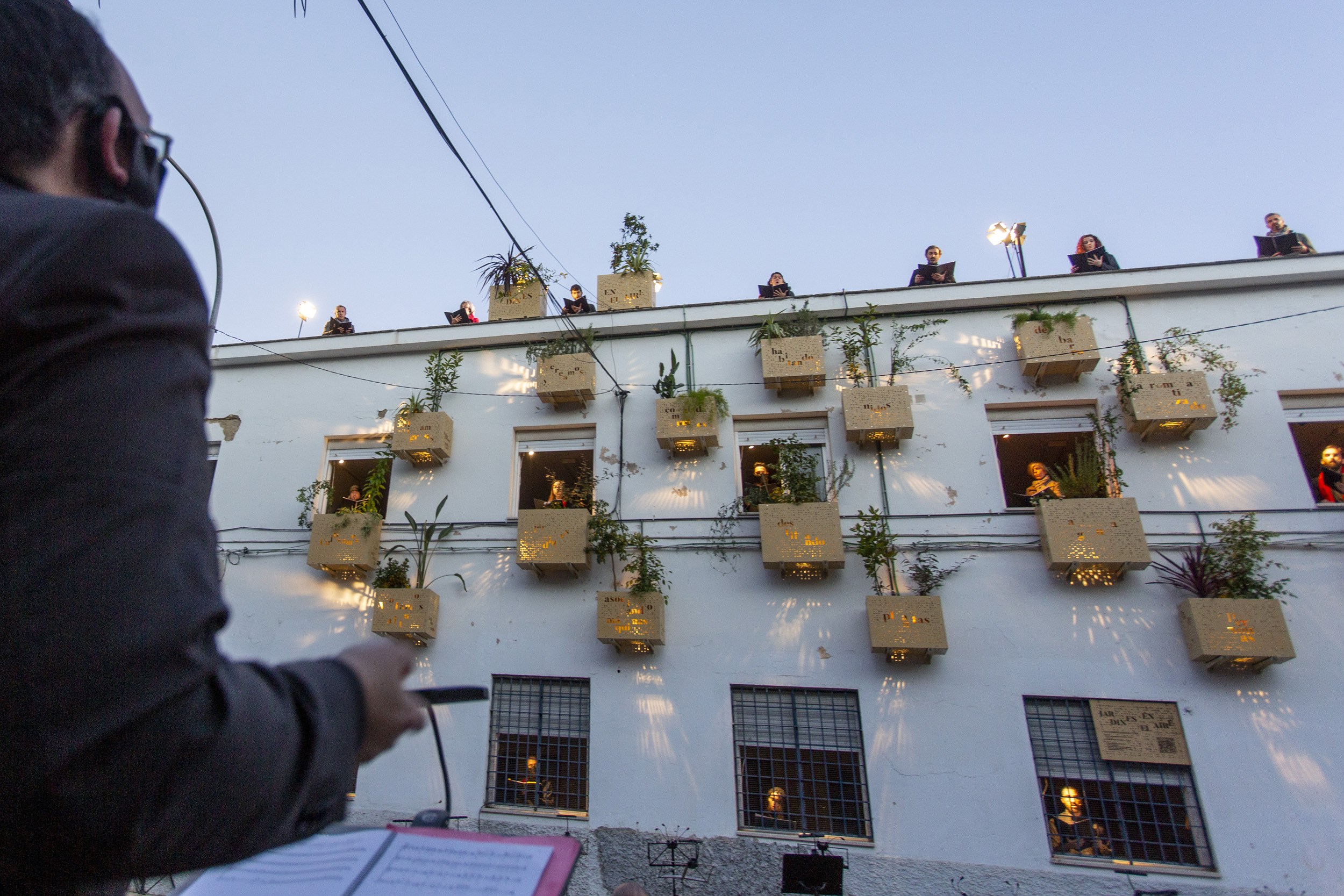 Llega el momento. Entra el público que, ordenadamente, comienza a ocupar sus asientos. Nos acompañan, desde las ventanas, vecinas privilegiadas que no quieren perder detalle. Saludos, bienvenidas y felicitaciones. “Me encanta” “¡Qué maravilla!”. Nuestra propuesta de este año imagina nuevas relaciones entre plantas, personas y pájaros a través de tres obras: el jardín vertical, la polifonía y el perfume.