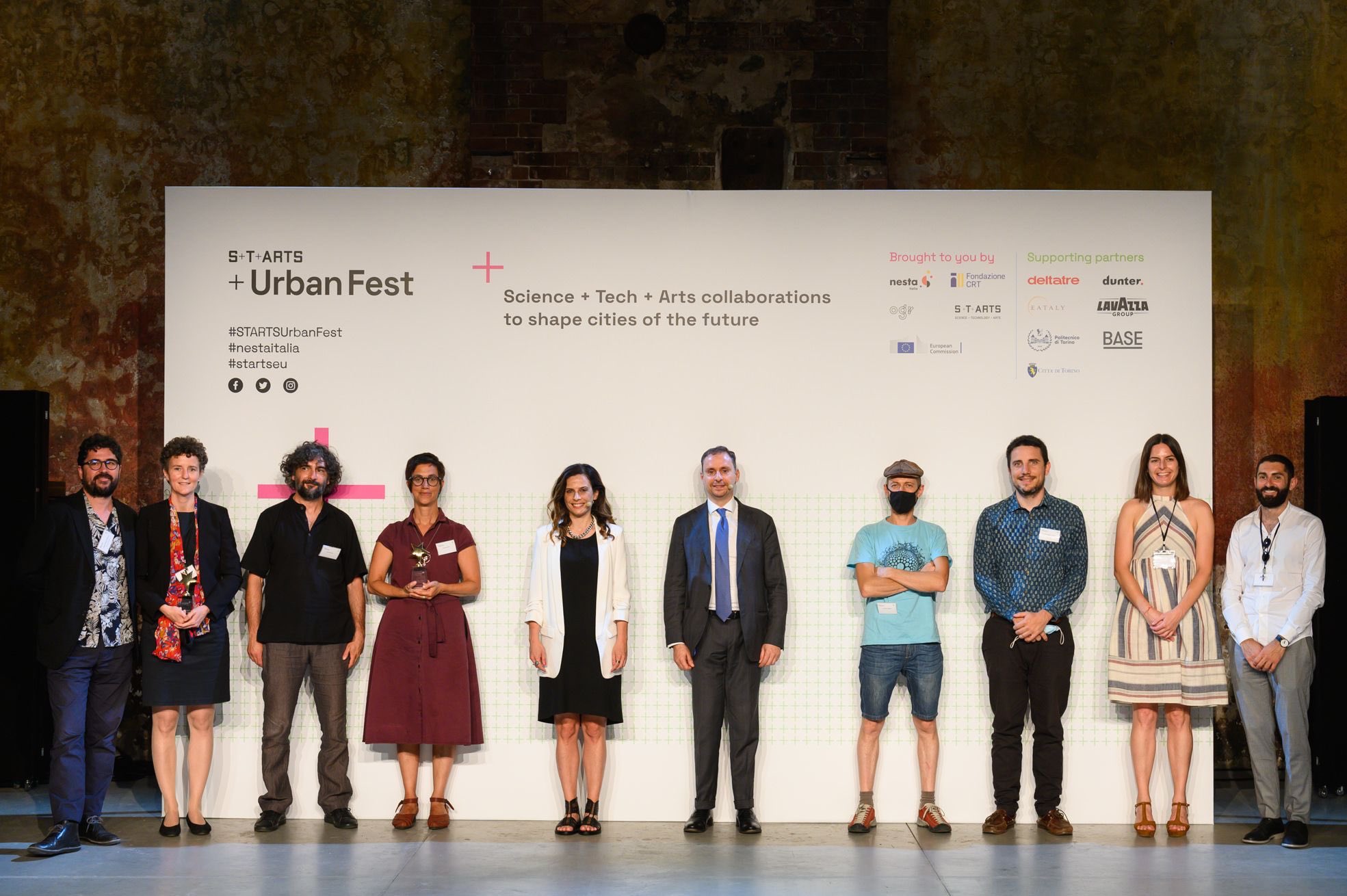 En la imagen, momento de la entrega de premios S+T+ARTS for Social Good en el Urban Fest celebrado en el centro OGR Torino el día 30 de junio con los galardonados Nomad Garden comisarios de Jardines en el Aire (premio internacional), Vanessa Vozzo (premio artista italiano), los representantes del jurado Francesca Bria (Nesta Italia) y Massimo Lapucci (Fondazione CRT, OGR Torino) y los semifinalistas nominados al premio Francesco Bertelé, Comp-Syn, Jessica Smarsch y Autofabricantes.
