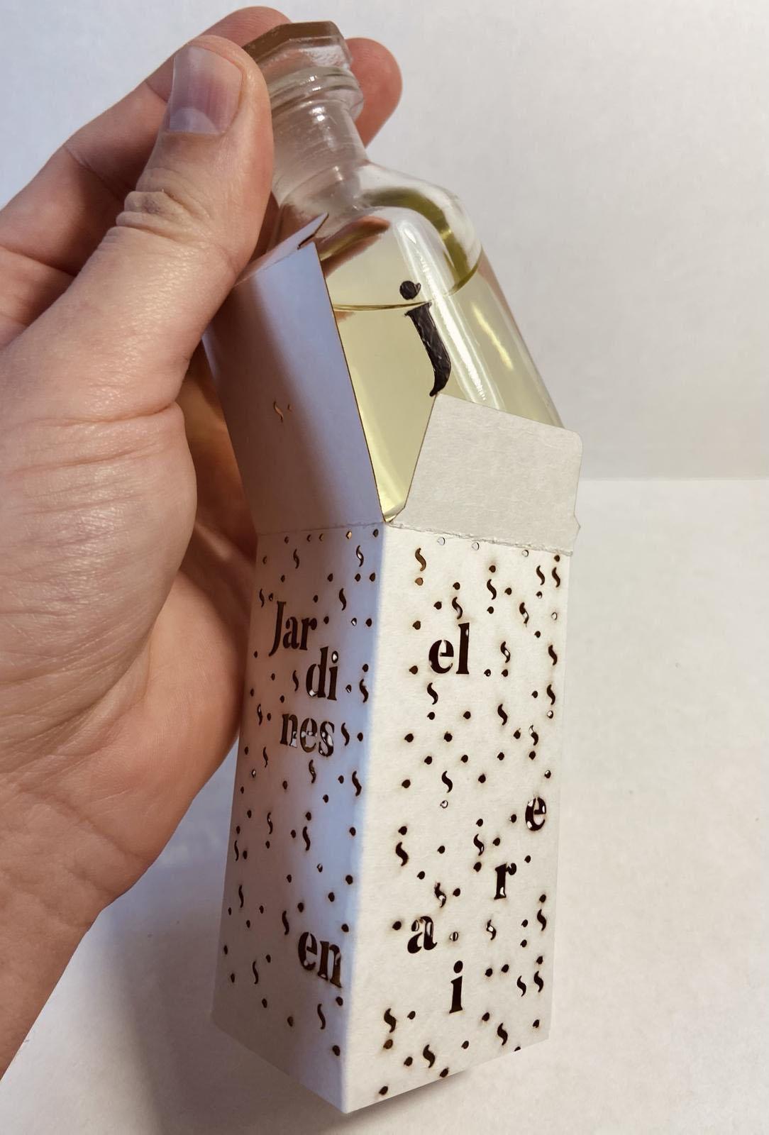 La segunda obra, consistente en la creación de un perfume -diseñado por el perfumista parisino Barnabé Fillion asistido por Thibault Pradet- a partir de algunas de las plantas más representativas del barrio y de la ciudad. Una propuesta que nace con el objetivo de desarrollar en fases sucesivas (actualmente estamos trabajando en ello en colaboración con ThermoFisher Science) la destilación de las propias esencias reutilizando los restos de podas de dichas especies en Sevilla, con el objetivo de impulsar una iniciativa de economía circular en Tres Barrios-Amate.