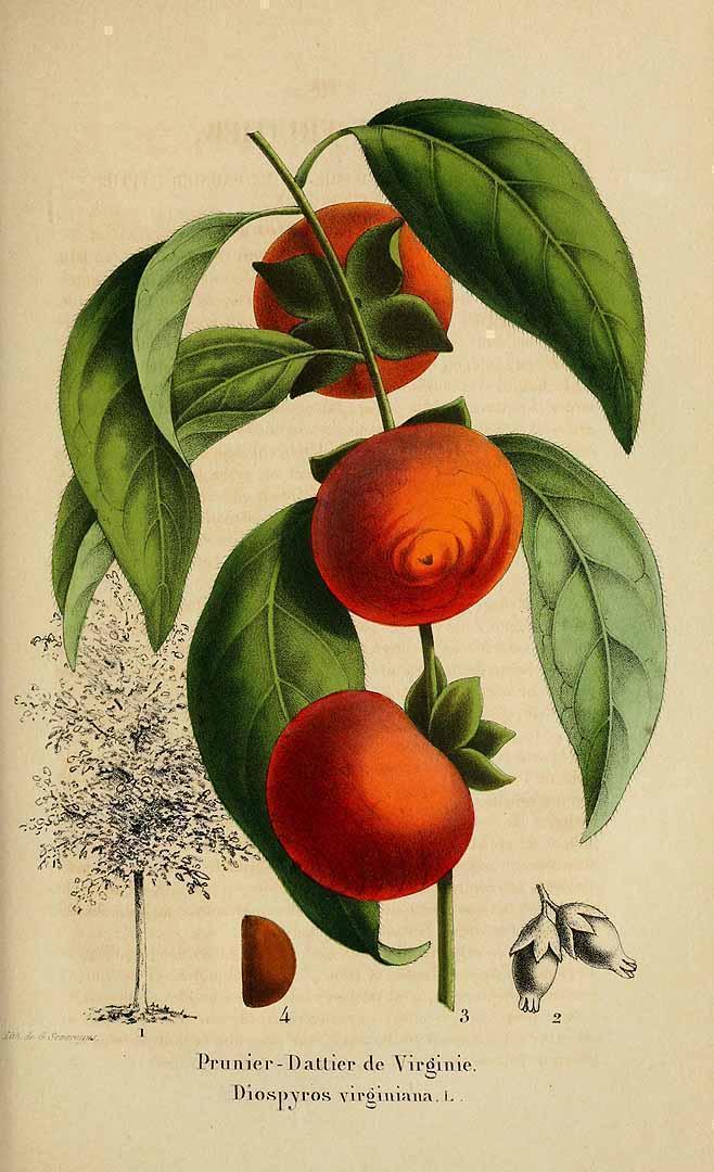 EbenaceaeDiospyros, proviene del las palabras griegas Dios, "divino", y pyros, "fruto" o "semilla": "semilla divina". En cuanto a virginiana, alude a su procedencia norteamericana, entre el este de Texas, Nueva Inglaterra y Florida, incluyendo el Estado de Virginia (EE.UU).