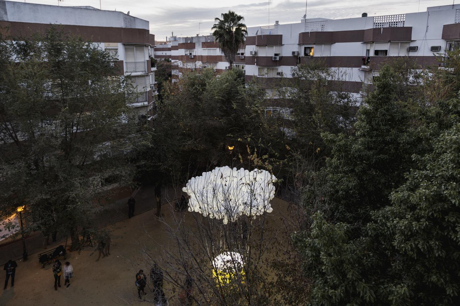 Todos habíamos visto cómo se inflaban pacientemente los globos, uno a uno, para crear ese techo imitando la forma de un olivo; cómo se les enlazaba el mensaje de cada persona o colectivo junto con las semillas de los Jardines de La Oliva; cómo se agrupaban y se ataban, con ayuda de una escalera, a la parte superior de la estructura del escrache; cómo algunos –inevitablemente– ya andaban sueltos por el cielo o en las manos (o pies, ya explotados) de algún crío. Había sido un trabajo colectivo, un esfuerzo al que todos los vecinos se habían entregado, y ahora tocaba dar un cierre a la altura de esa labor.