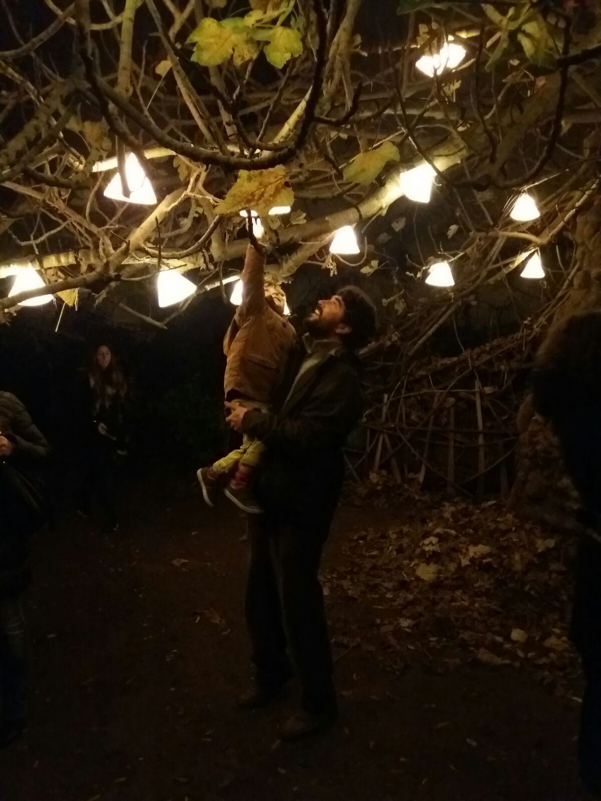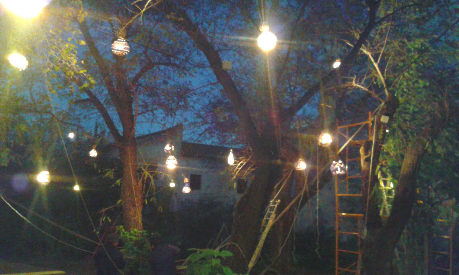 La mañana del 23 de diciembre la pasamos ultimando detalles, acicalando al Huerto del Rey Moro. Terminamos de pintar y perforar las calabazas-lámpara que se colgaron en las ancianas moreras bajo el calorcito del sol invernal, probamos las lámparas de telas estampadas repartidas sobre la higuera, se terminaron de colocar bombillas en otros puntos: el naranjo-limonero o la cúpula geodésica. ¿El resultado de este trabajo de grupo…? ¡Juzgad con vuestros propios ojos!