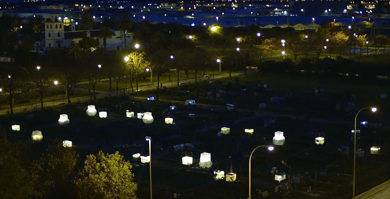La consecución de la acometida provisional hizo que la Huerta de san Antonio adquiriese un estado de en tránsito en concordancia a la instalación lumínica. Un estado de expectación por ver si finalmente se convertía el agua en luz, si aquellos bidones que tanto habían entorpecido se convertían en la pieza efímera que debieron ser desde un principio. La vaporosidad de las telas, la fragilidad de las cañas, el paisaje sin terminar de construir, todo por reforzar el site-specific topológico: aquello no estaba bien: la celebración consistiría más en los momentos previos al desmontaje, cuando se elimina más sustancia de la que se añadió en favor de que permanezca la energía.