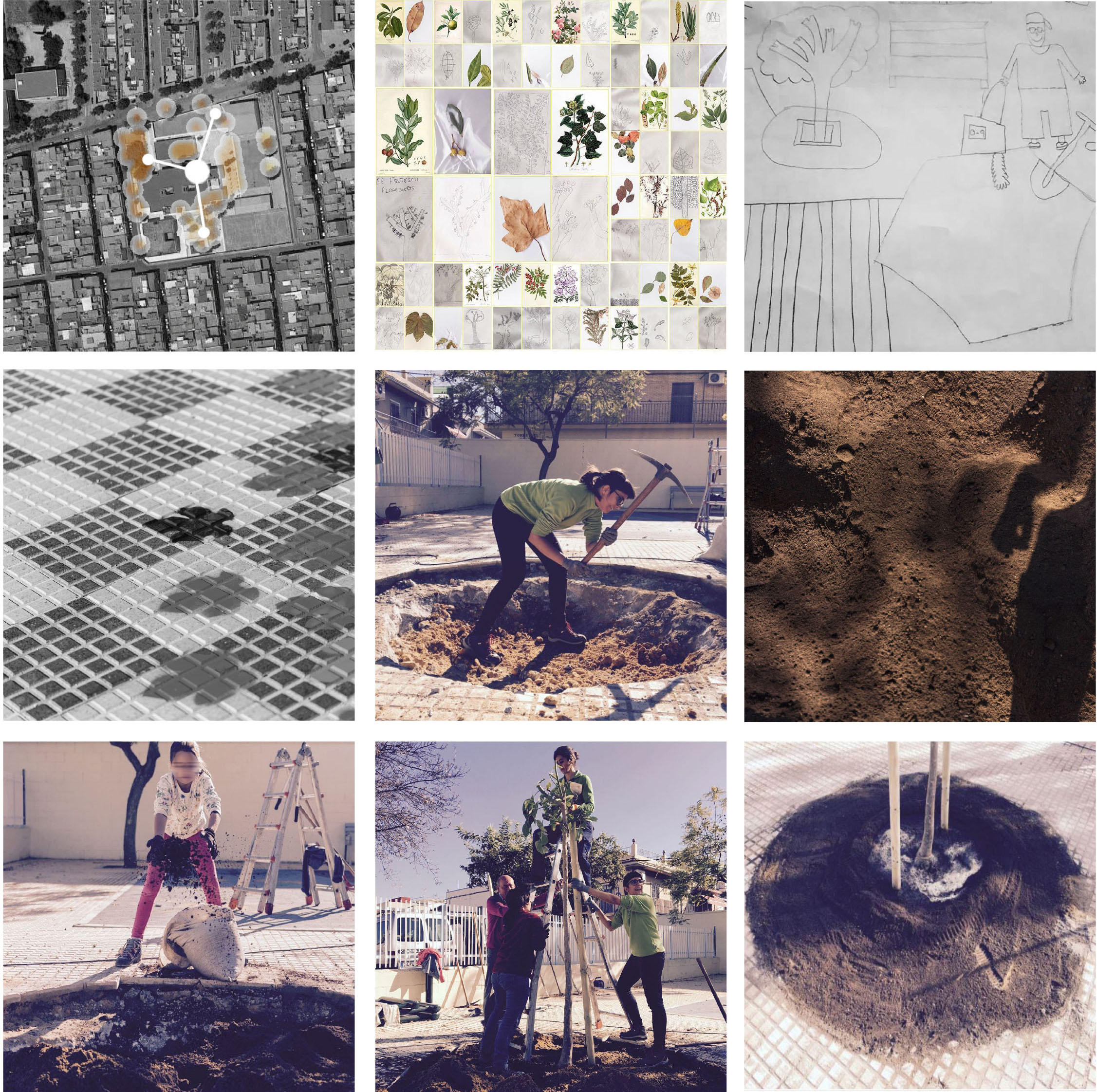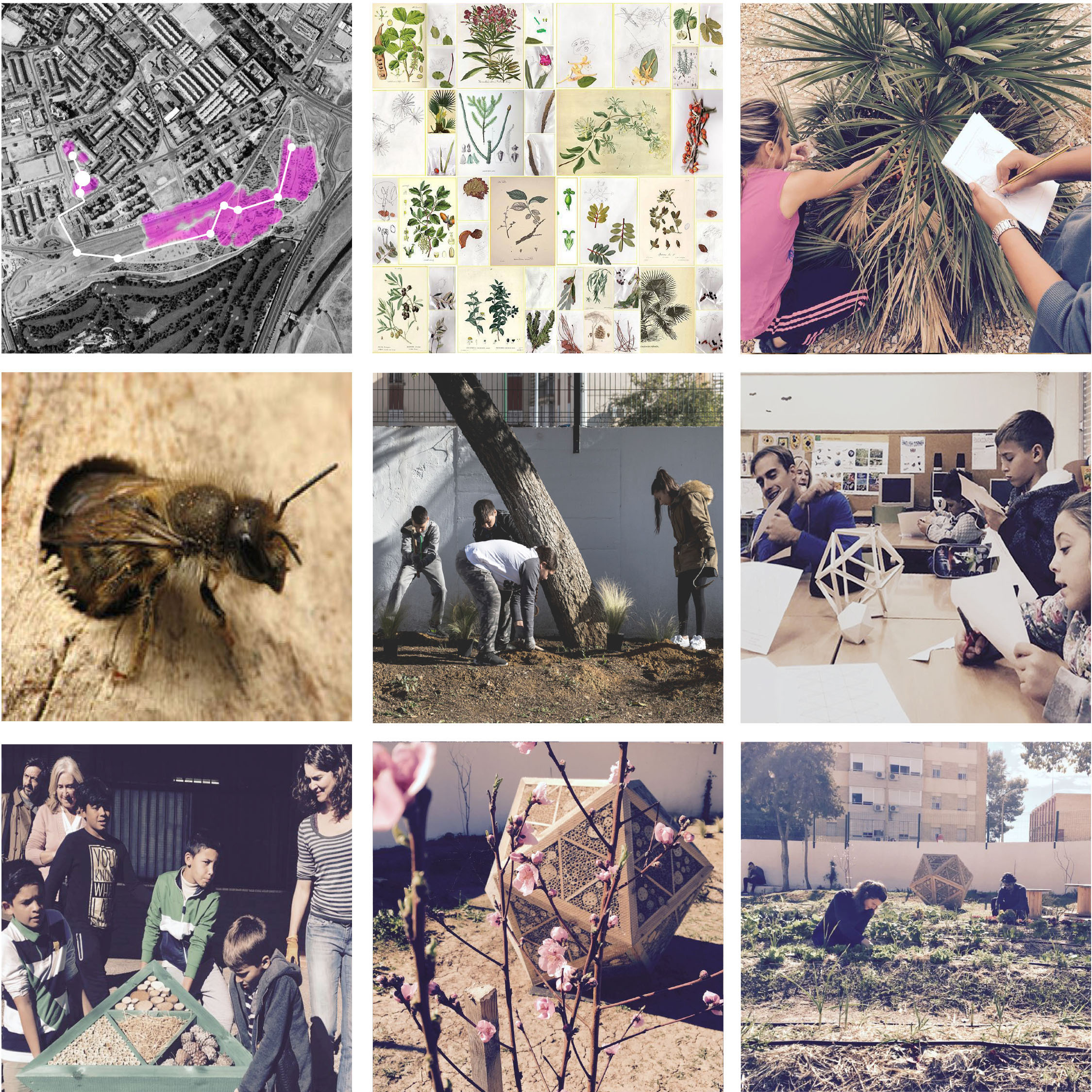 A continuación nos gustaría dar la enhorabuena a las comunidades educativas con las que hemos trabajado este año y cuyos proyectos de largo recorrido son, en definitiva, los reconocidos con esta selección. Después de todo el objetivo inicial de Luces de barrio era celebrar la labor de estas instituciones que están repensando los entornos escolares como espacios innovadores de aprendizaje, integración y sostenibilidad. Concretamente nos referimos a los colegios de Huerta de Santa Marina en el distrito centro, Vélez de Guevara en Torreblanca, Andalucía en la barriada Murillo, San José Obrero en la Macarena y el instituto Salvador Távora en Rochelambert, y especialmente a sus ejemplares equipos directivos, de los cuales hemos aprendido tanto, y a los más de 250 estudiantes que elaboraron los inventarios de especies botánicas de sus entornos más cercanos, compartieron lo hallado con la ciudad a través de cartografías digitales, y diseñaron a partir de los nuevos conocimientos y con ayuda de profesionales, paisajes potenciales orientados a mejorar la salud, el clima, la alimentación, la biodiversidad y la educación de los propios colegios a través de estrategias basadas en la naturaleza.