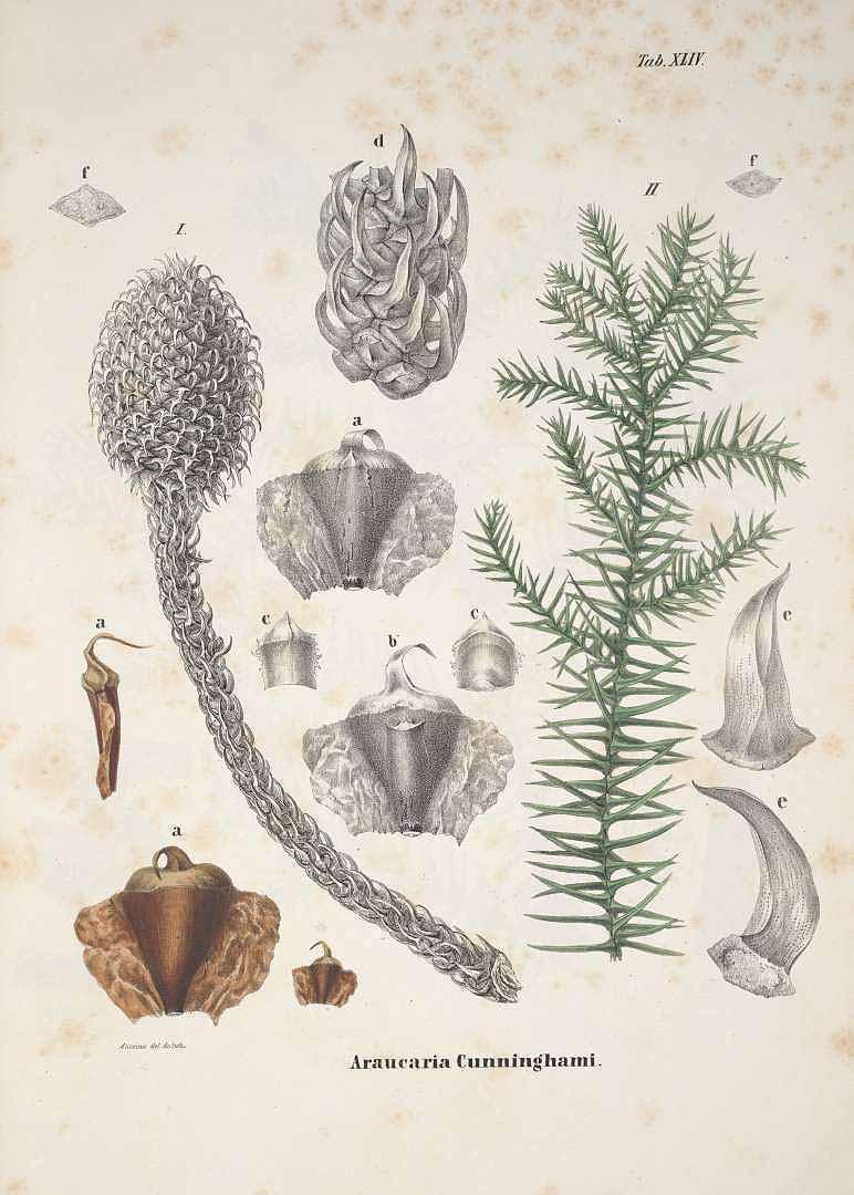 AraucariaceaeEl género Araucaria toma su nombre de la región chilena de Arauco, donde se descubrió la primera especie. Aunque se descubrió ya en el s. XVI, fue Joseph Banks, uno de los botánicos que acompañaron a James Cook, quién trajo varias especies de araucarias a Europa. El epíteto específico cunninghamii es en honor del botánico y explorador inglés Allan Cunningham, a quién Banks eligió como recolector del Real Jardín Botánico de Kew, y está enterrado en el Real Jardín Botánico de Sydney.