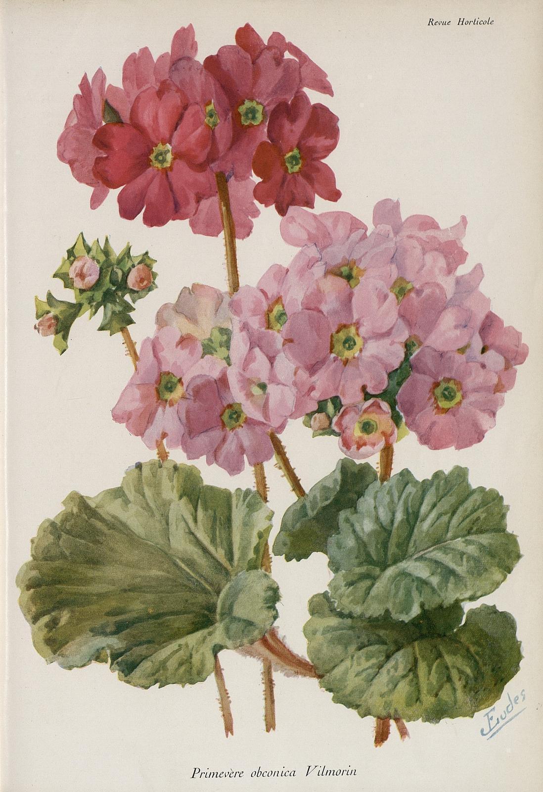 La prímula obcónica tiene hojas semicirculares que nacen en forma de roseta de cuyo centro surgen las flores. Hay múltiples variedades con colores que van desde el blanco, al azul, pasando por una amplia gama de amarillos, naranjas, rojos y rosas. Otras especies del mismo género utilizadas en jardinería son: Primula aucalis, Primula officinalis, Primula sieboldii, Primula denticulata, Primula capitata, Primula aurantiaca, etc.Procedencia