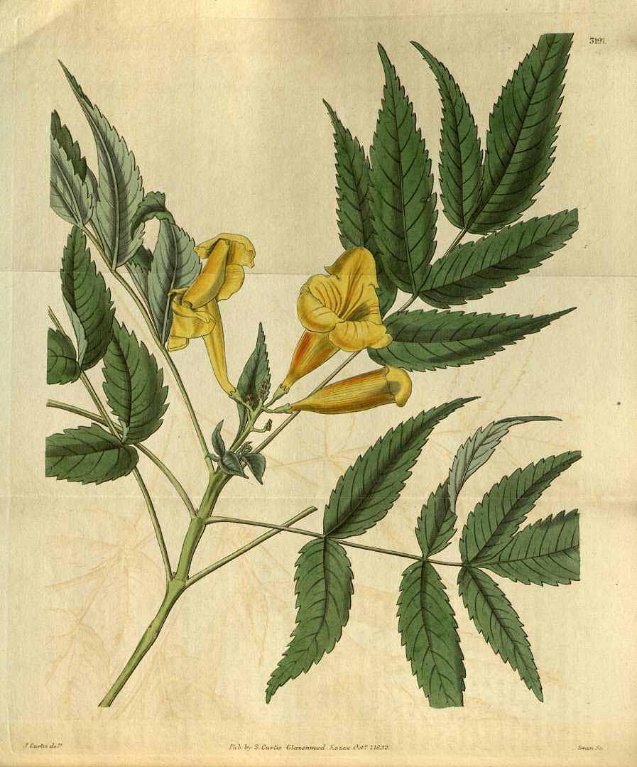BignoniaceaeEl género Tecoma es una abreviación del nombre nahuatl tecomaxochitl, mientras stans deriva del latín para 'erecto' por sus inflorescencias.