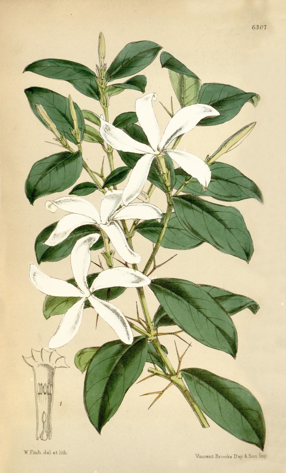 Sus flores blancas perfumadas de 5 pétalos recuerdan a la flor del jazmín, pero son mucho más grandes. Los frutos rojos, en forma de ciruelas alargadas, también se cultivan fuera de su hábitat natural en Nicaragua. Sus raíces también tienen usos medicinales en la tradición zulú.