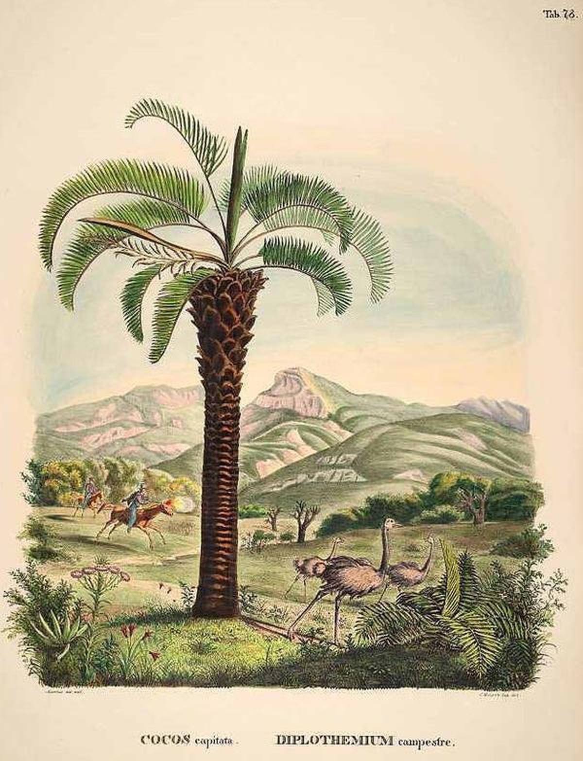ArecaceaeEl nombre Butia deriva de de hecho de un término de los indígenas de esta región, mbotia que a su vez viene de mbo, hacer, y tia, diente curvo, en referencia a los dientes que revisten el peciolo de la hoja. capitata es un término latino que hace alusión a la cabeza, ya que esta palmera achaparrada, que apenas sobrepasa los 6 metros de altura, recibe el nombre común de "cabezón" por los mineros de Bahía. En este estado brasileño y en los de Goiás y Minas Gerais, la butia es especie endémica.