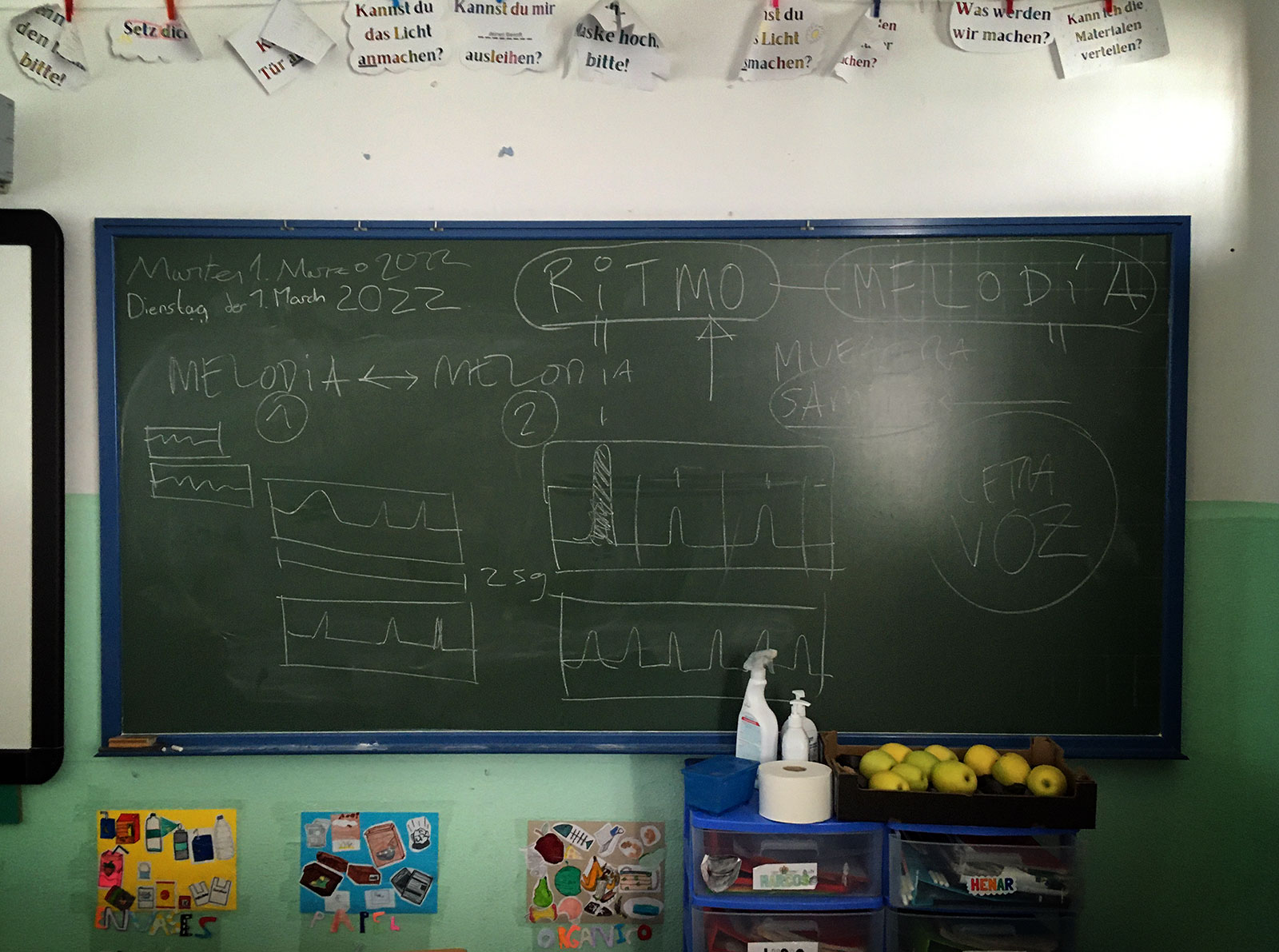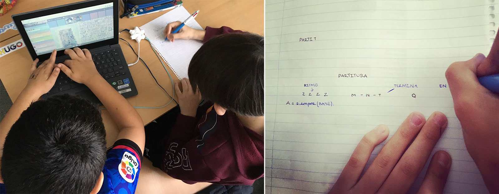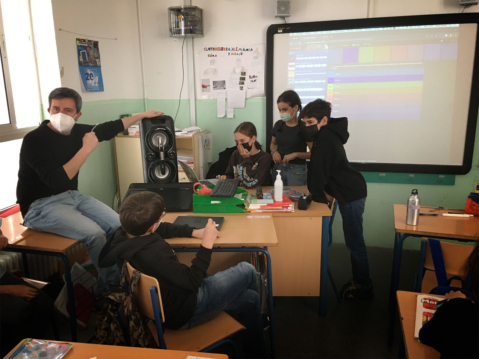Las dinámicas de las sesiones se basan en la exploración compositiva con play.antropoloops y la puesta en común al final de la clase tocando en directo los avances realizados. Comentamos en grupo la percepción de las mezclas y posibles vías de trabajo y mejora.