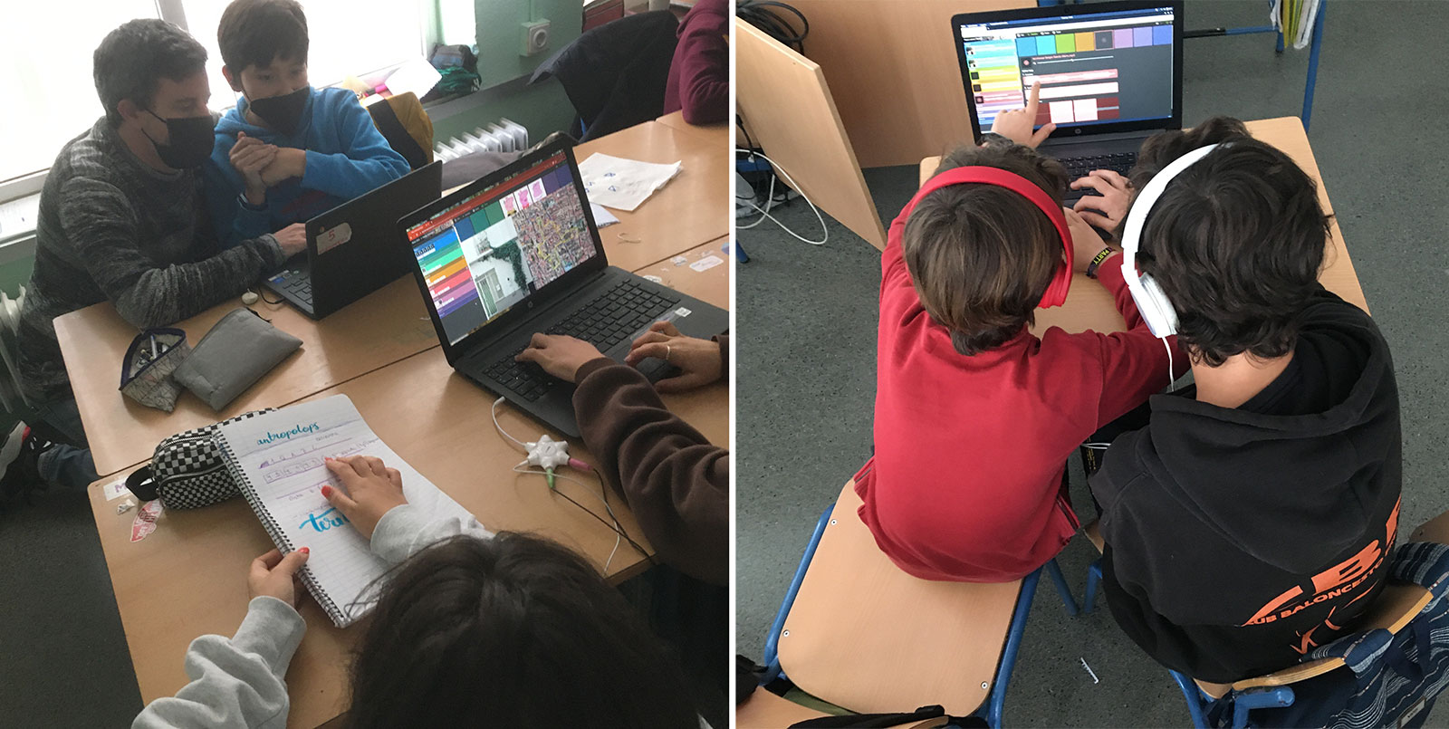 Comenzamos trabajando con las librerías que hemos creado para músicas del barrio (selección de piezas de flamenco, semana santa y otras expresiones interesantes) y para cada una de las plantas investigadas. Cada pareja tiene que escuchar, seleccionar piezas y comenzar a crear loops que les parezcan interesantes, así empezamos a explorar el collage sonoro y las posibilidades de combinación de unos fragmentos con otros.