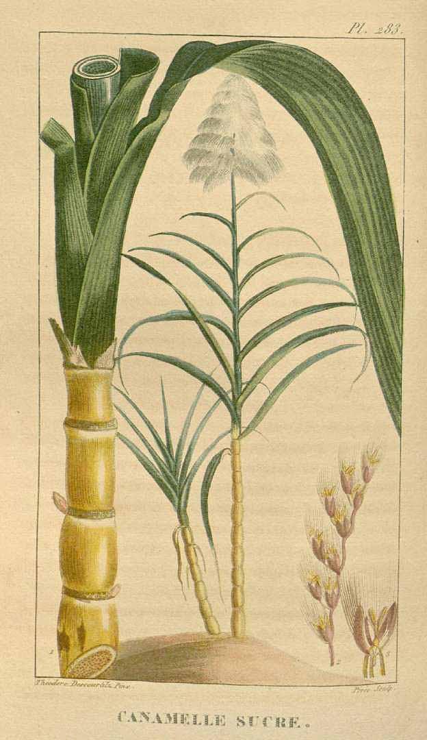 Es una especie de hierba perenne alta (a menudo híbrida) (del género Saccharum, tribu Andropogoneae) que se utiliza para la producción de azúcar. Las plantas miden de 2 a 6 m (6 a 20 ft) de altura con tallos robustos, articulados y fibrosos que son ricos en sacarosa, que se acumula en los entrenudos del tallo. La caña de azúcar pertenece a la familia de las gramíneas, Poaceae, una familia de las angiospermas económicamente importante que incluye maíz, trigo, arroz y sorgo, y muchos cultivos forrajeros. Es nativo de las regiones templadas cálidas y tropicales de la India, el sudeste de Asia y Nueva Guinea.