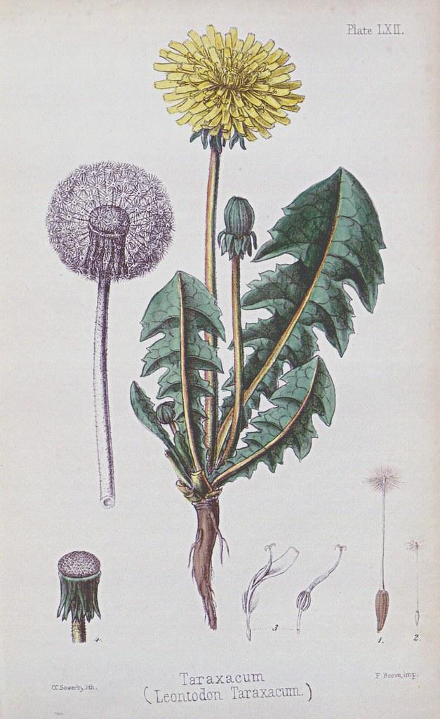 El diente de león común (Taraxacum officinale, en chino: pugongying) es una planta herbácea vivaz de la familia de las asteráceas. Posee hojas desde la base dispuestas en roseta, muy lobuladas y dentadas, y una raíz central larga y gruesa. Sus flores amarillas forman grandes ramilletes, visibles desde primavera hasta el verano en las ricas praderas para la apicultura. La planta segrega una savia lechosa en todas sus partes.