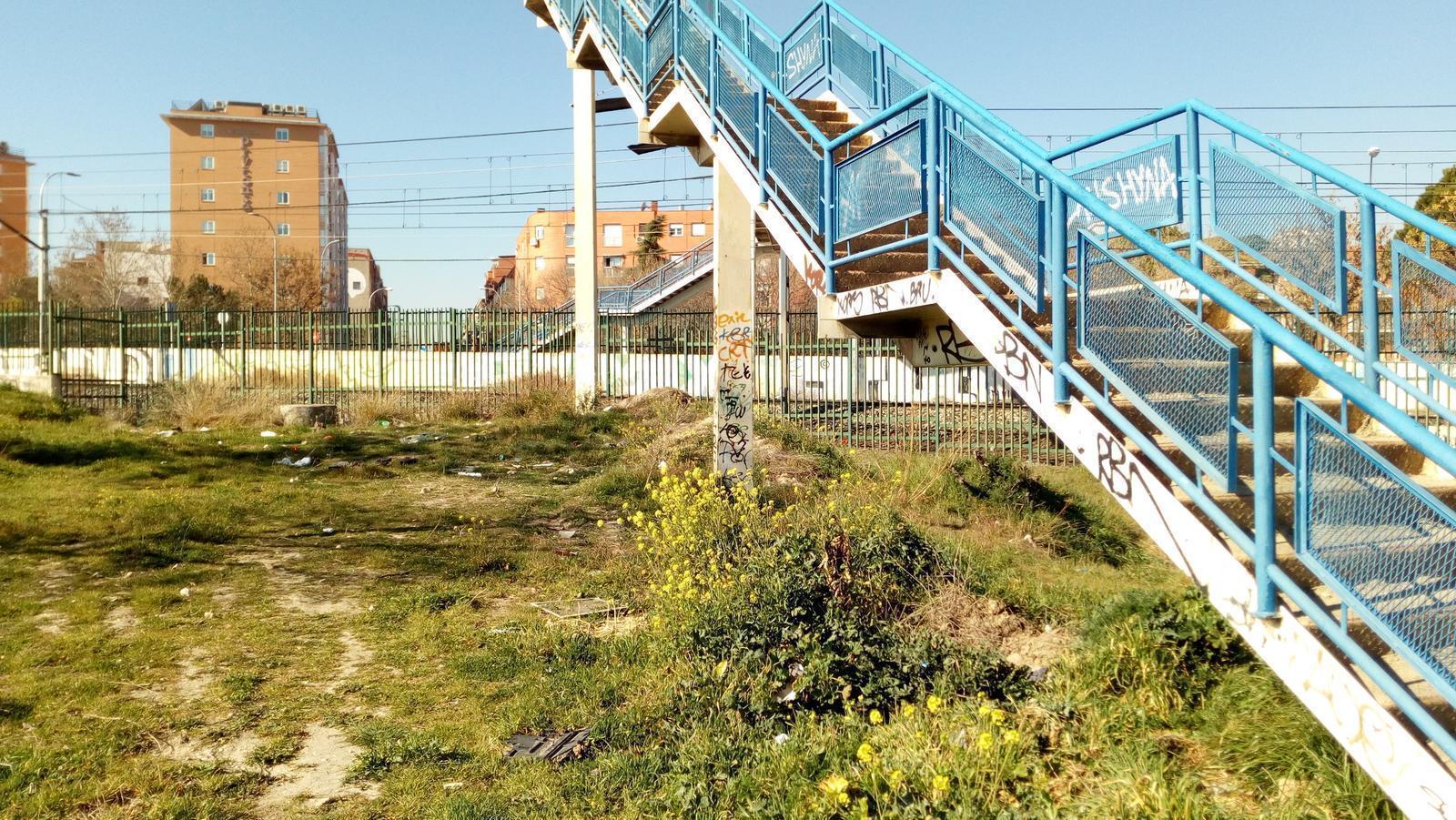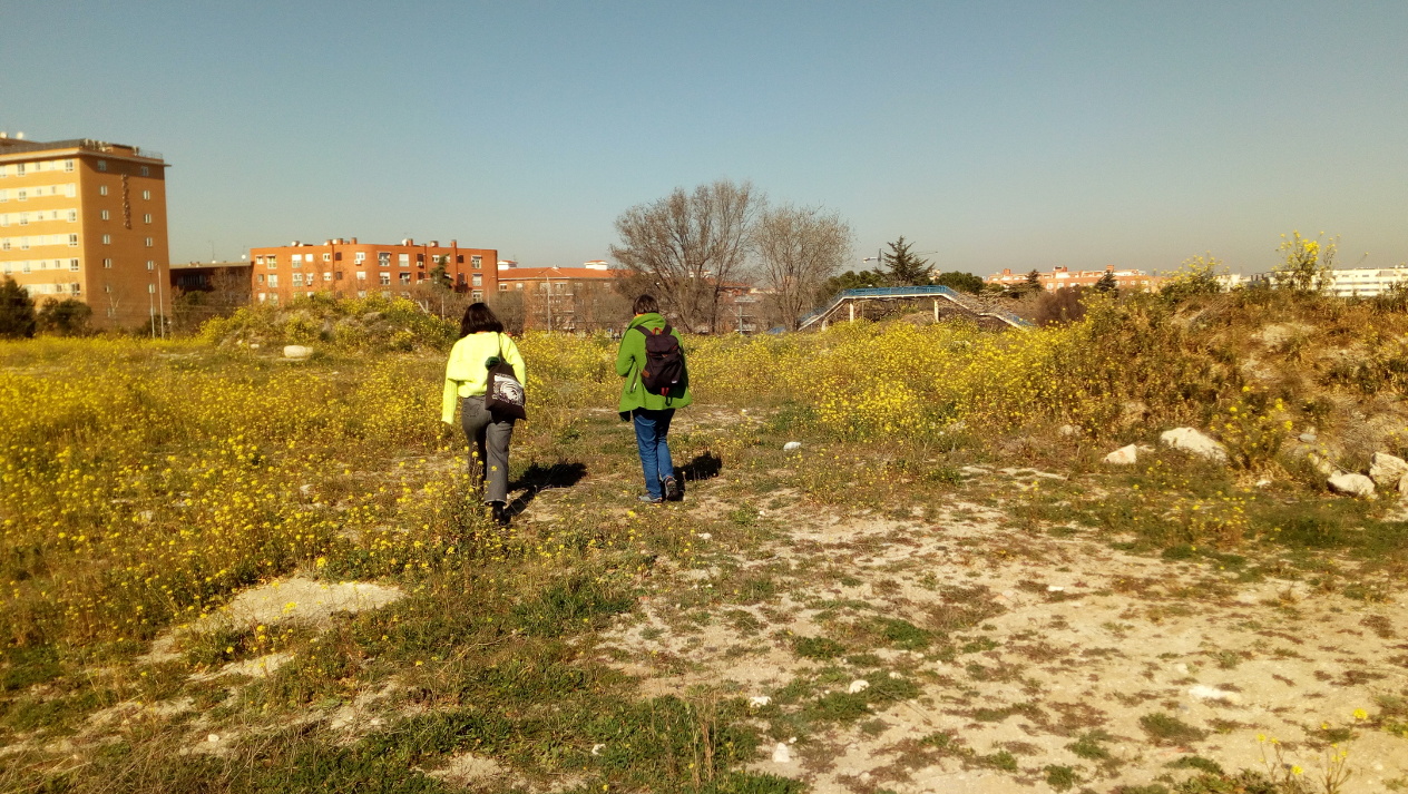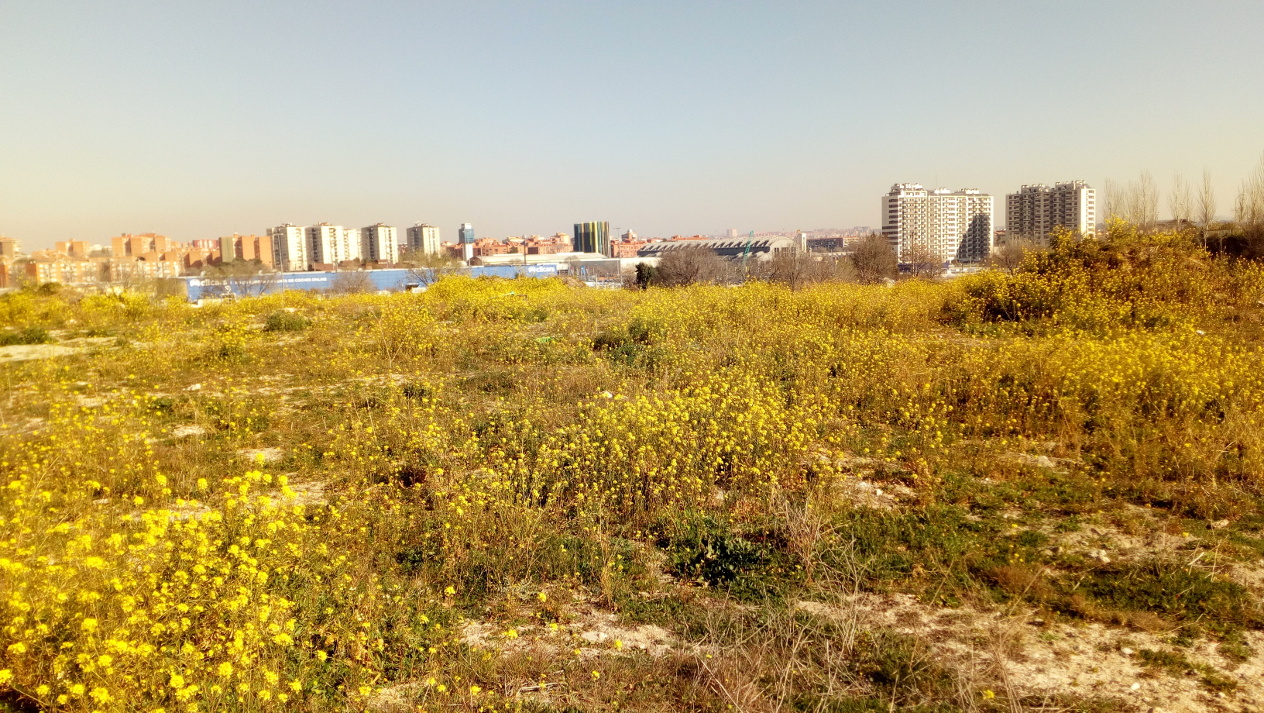 Mientras anotábamos la flora espontánea del descampado, tras la verja que separa el centro de Afandice del solar que estábamos explorando, apareció Antonio con sus alumnos para saludarnos. Nos comentó que yendo hacia la Gran Vía de Villaverde, cruzando un puente bajo el que discurrían las vías del tren, había un descampado que estaba cubierto de un manto amarillo de jaramagos.