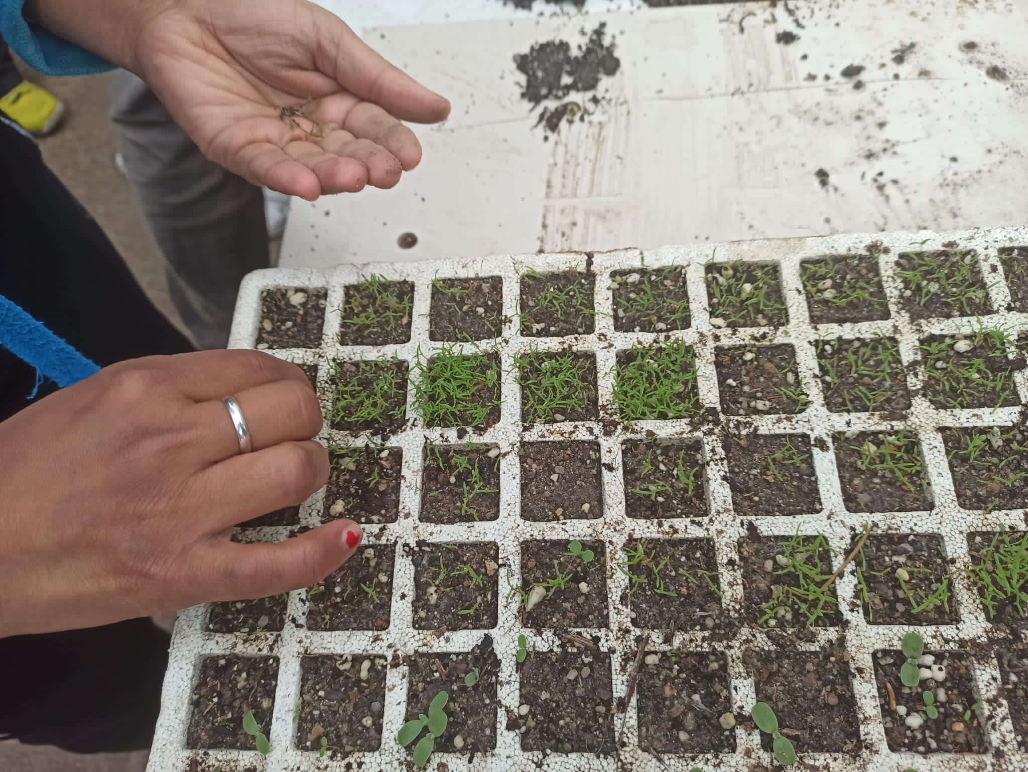 El arte de repicar no es nada sencillo, requiere orden y concentración. Elegir la planta con el tamaño idóneo de la bandeja de alvéolos para trasplantar e introducir por su parte posterior, en el agujero exacto de la fila y columna de la bandeja, el punzón para extraer el cepellón entero con sus raíces requiere cierta destreza nipona.
