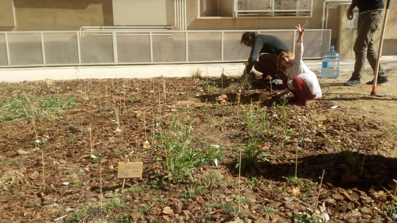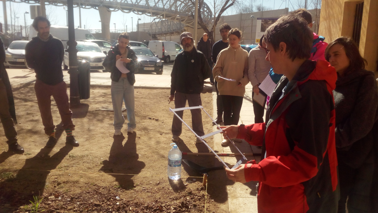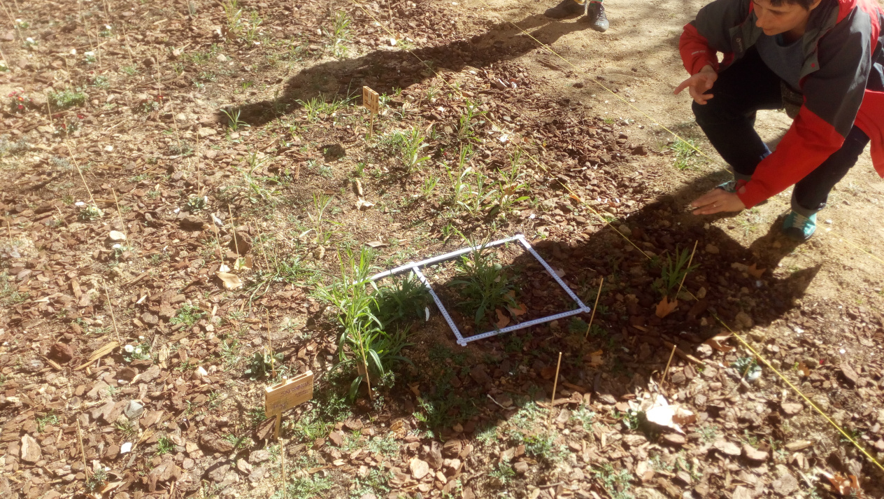 A continuación, tras explicarnos la hoja de ruta, nos dividió en 4 grupos para inventariar los 4 cuadrantes en que delimitó el jardín. Cada cuadrante se dividiría en 4 subcuadrantes de un metro cuadrado. Mrs Alba sacó el metro y dibujo un cuadradro perfecto que posó sobre el terreno. Dentro de ese cuadrado iríamos tomando notas: ph, temperatura, luminosidad, % de cobertura vegetal, altura de las plantas presentes.