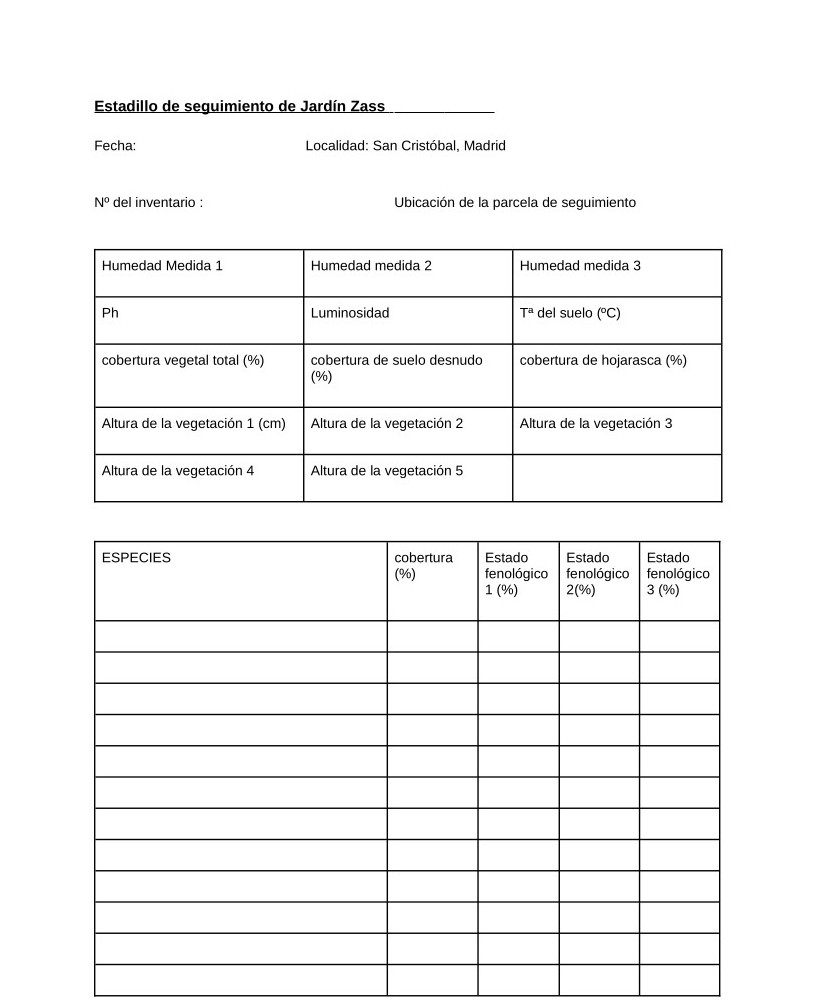 Pero allí estaba Mrs Alba, dispuesta a impartir un taller de seguimiento de la vegetación de un jardín en movimiento siguiendo un método científico. Se presentó con una hoja que respondía al nombre de “estadillo de seguimiento” y en el que anotaríamos una serie de parámetros que nos ayudarían a leer el indescifrable jardín que amenazaba con escaparse.