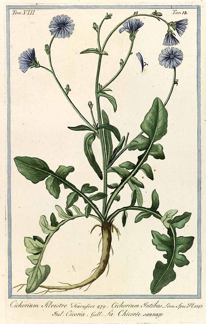 La achicoria es una hierba que forma una roseta de hojas basales, que son comestibles cuando son tiernas. Cuando florece forma muchas ramas que se vuelven a ramificar varias veces; estas ramas tienen hojas muy pequeñas y pueden parecer afilas. Sobre ellas se abren los capítulos azules, grandes y muy visibles. Florece a principios del verano